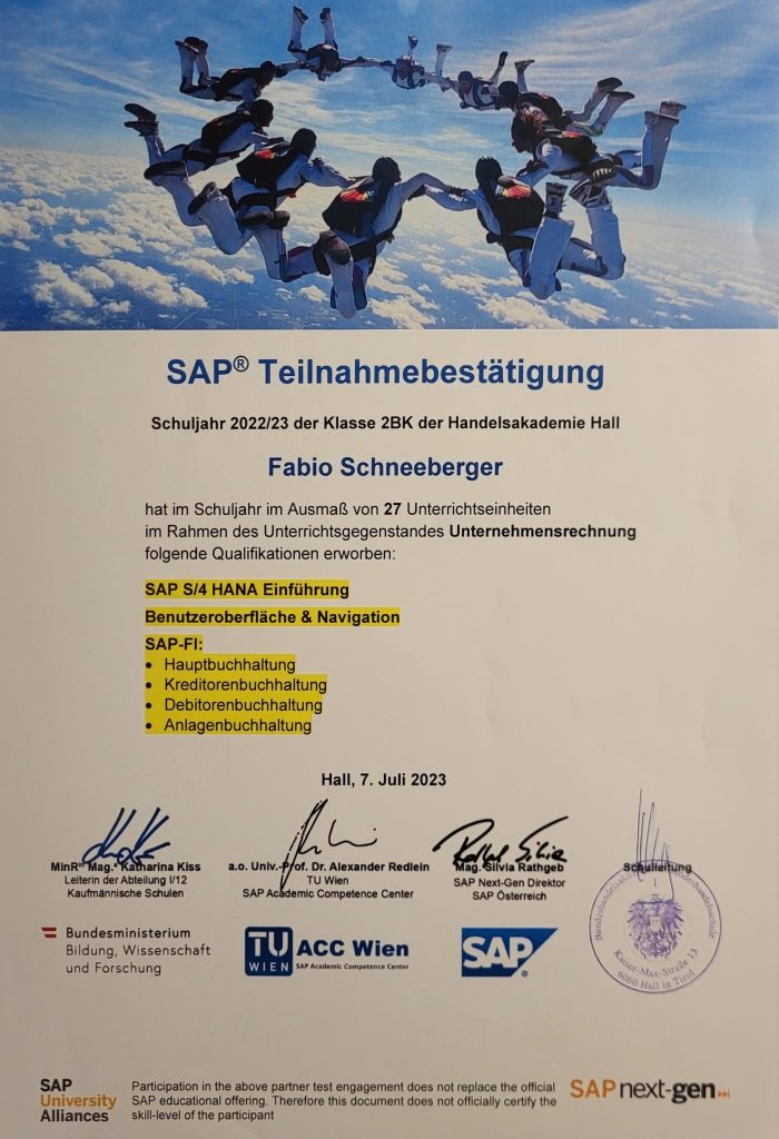 Da ich am SAP Unterricht teilgenommen habe, habe ich ein Zertifikat bekommen: